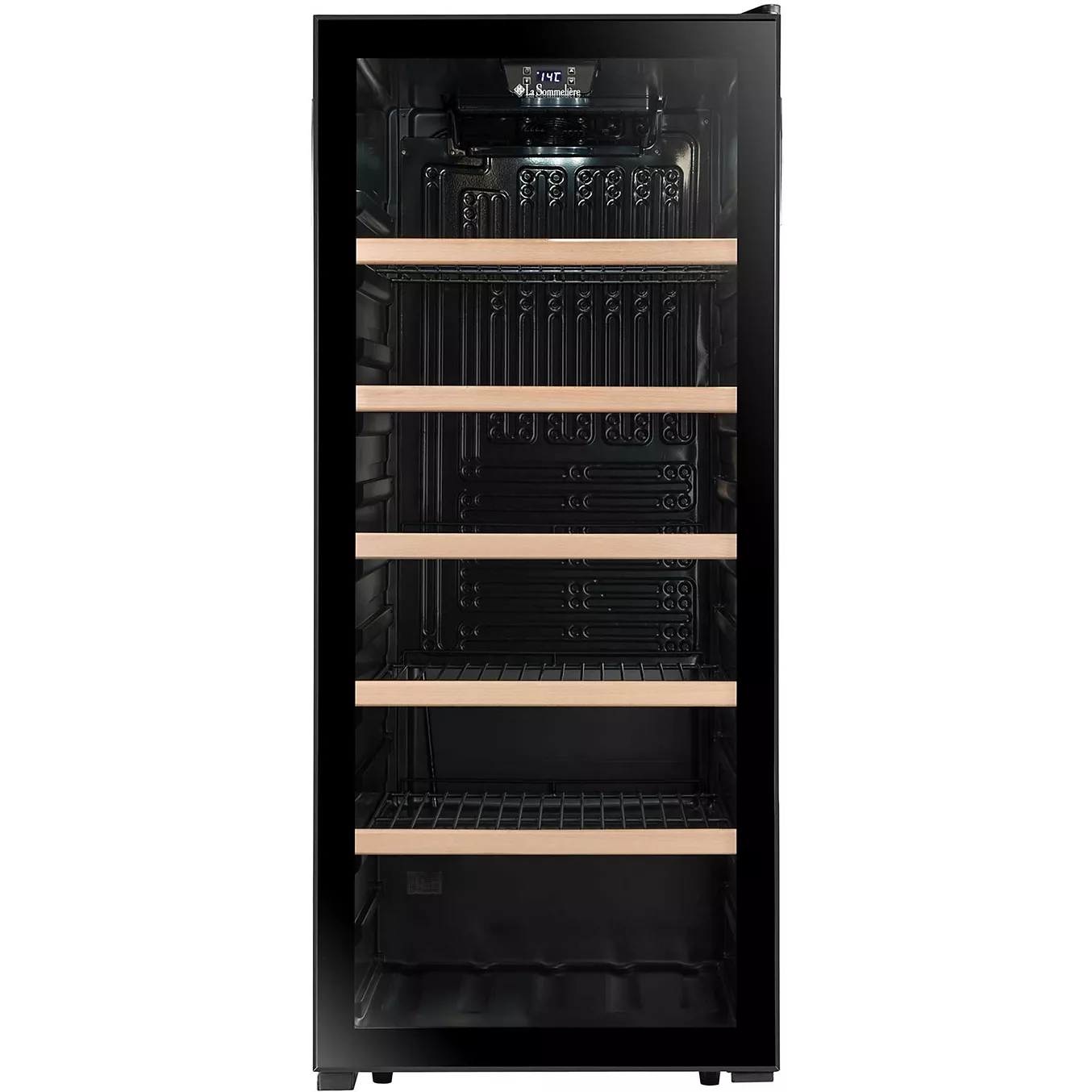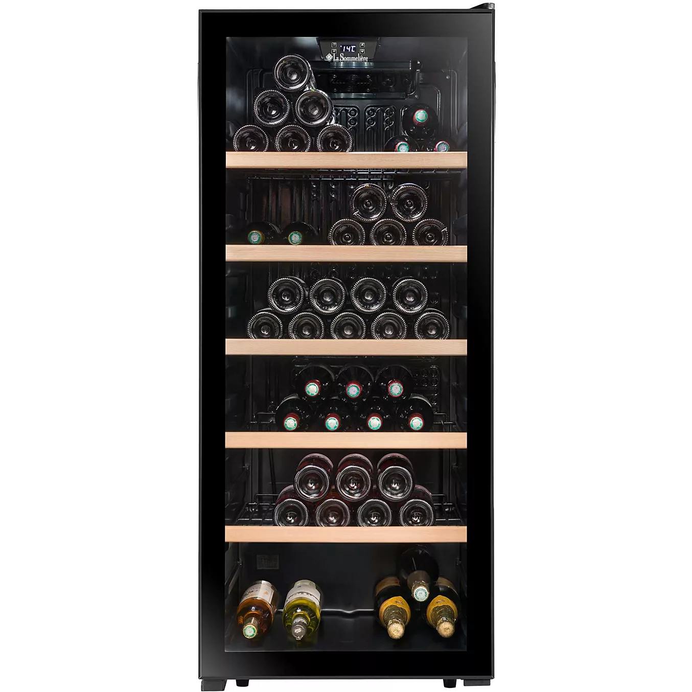 Le réglage électronique de la température (plage de 5 °C à 20 °C) permet de maintenir des conditions stables pour vos vins rouges, blancs ou rosés. Un éclairage LED intérieur met en valeur vos bouteilles sans émettre de chaleur nuisible et facilite le repérage des crus. Les clayettes amovibles en acier avec frontons en bois offrent une organisation flexible de l’espace de stockage.