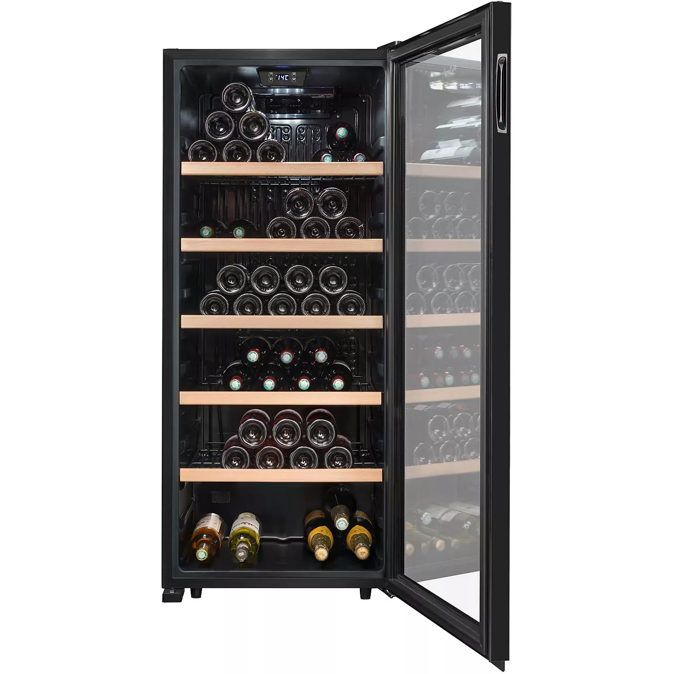 Cave à vin de service spacieuse avec capacité jusqu’à 121 bouteilles, réglage électronique de la température (5 °C à 20 °C), éclairage LED et clayettes amovibles pour une conservation maîtrisée et élégante des vins.